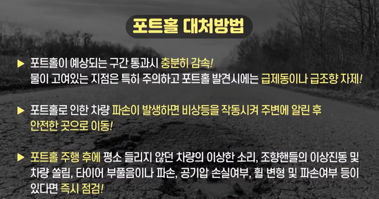 - 포트홀 발견할 시에는 급제동이나 급조향을 자제!